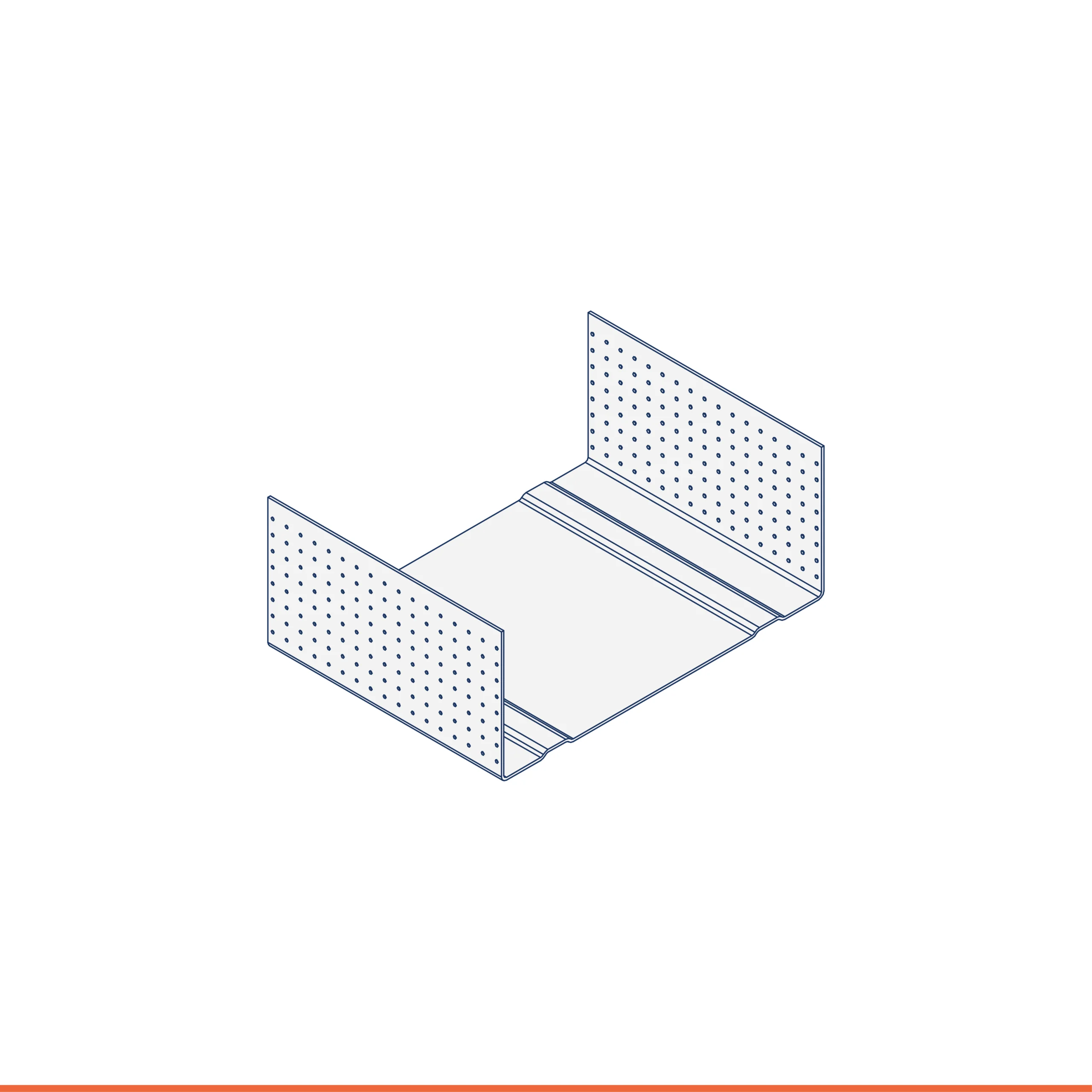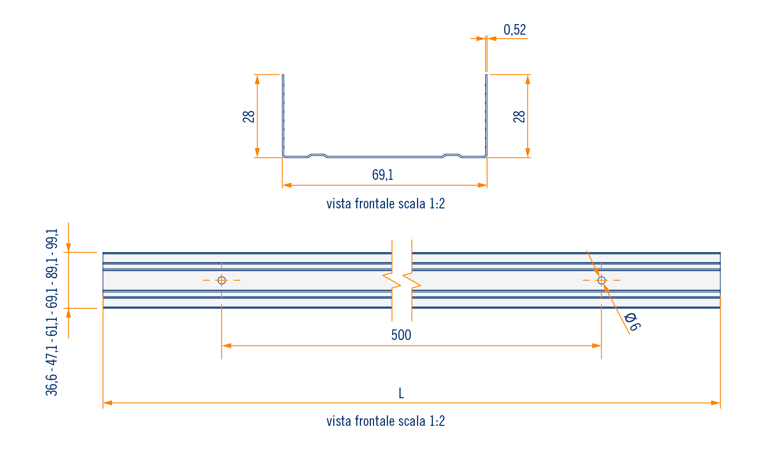 Guida ad U di base 69 mm, altezza 28 mm e spessore 0,52 mm con adattabilità U/28/69/28/3000 per contropareti e pareti.