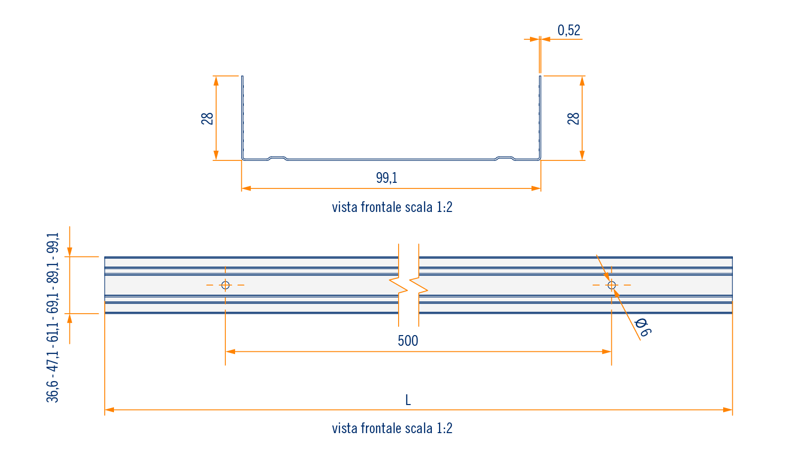 Guida ad U di base 99 mm, altezza 28 mm e spessore 0,52 mm con adattabilità U/28/99/28/3000 per contropareti e pareti.